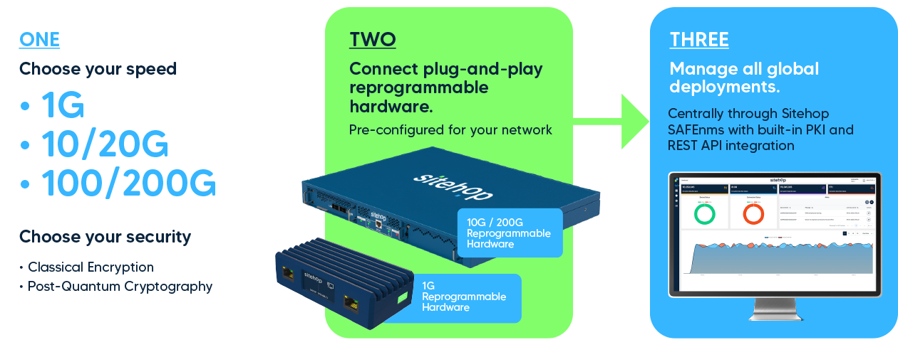 The Sitehop SAFE Series delivers hardware-accelerated encryption for data-in-motion with sub-microsecond latency, crypto-agile FPGA architecture, and quantum-ready protection. Choose your speed, encryption model, and deployment strategy all managed seamlessly from one global console, Sitehop SAFEnms.